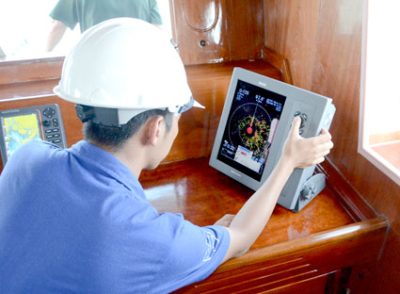 Các tàu khai thác, dịch vụ hậu cần thủy sản được trang bị các thiết bị hiện đại như máy quét rađa, la bàn vệ tinh và định vị GPS. Trong ảnh: Cân chỉnh máy quét rađa trước khi xuất bến.