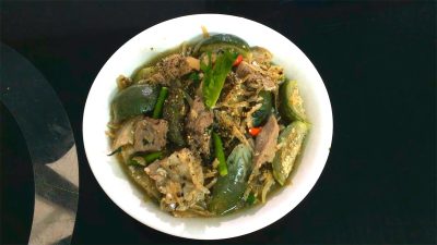 Canh cà đắng cá khô là một món ăn dân dã, mang đậm hương vị núi rừng Tây Nguyên, đặc biệt là của người Ê Đê. Món ăn này được chế biến từ những nguyên liệu đơn giản, dễ tìm như cà đắng, cá khô, thịt ba chỉ, ớt, gia vị.