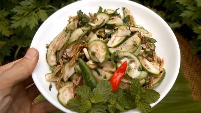 Gỏi cà đắng cá khô thường được ăn kèm với cơm trắng, rau sống và chén nước mắm ớt. Món ăn này là một lựa chọn lý tưởng cho những ngày hè nóng bức.
